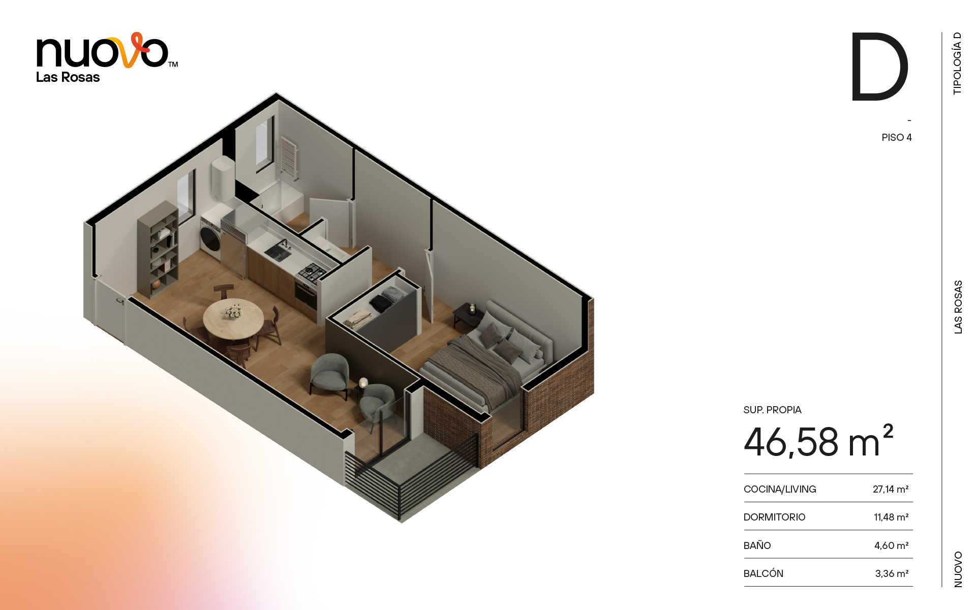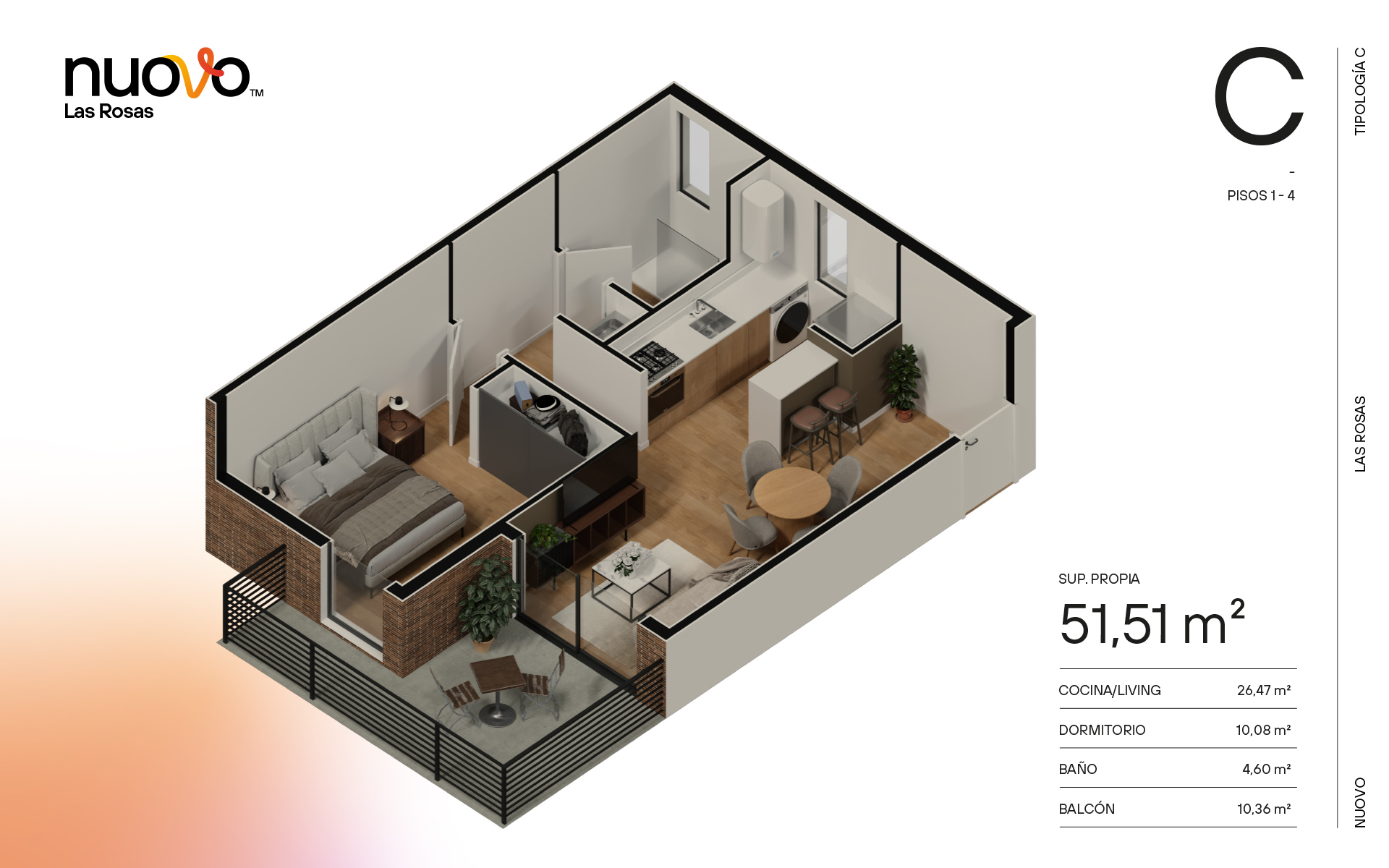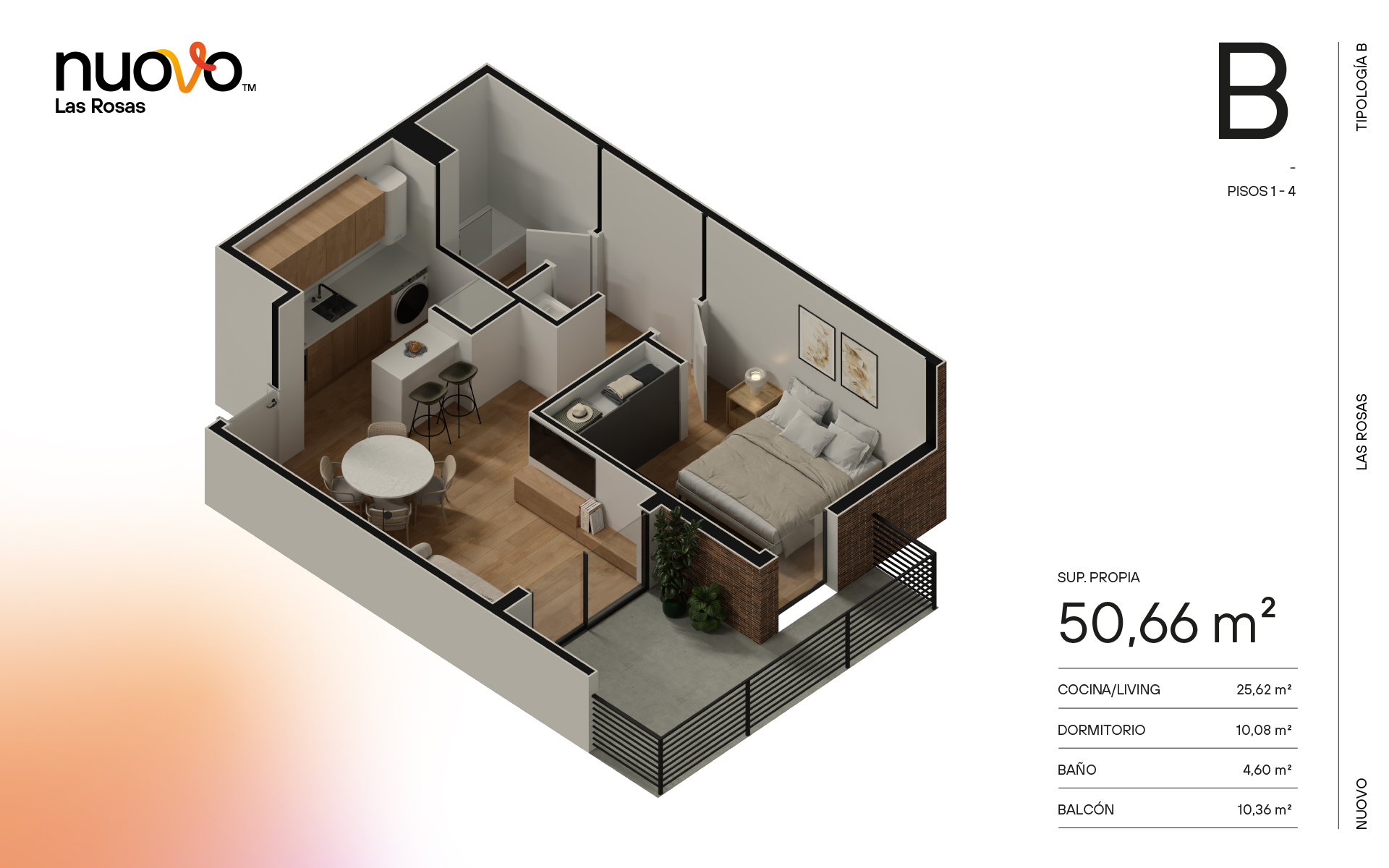 Nuovo® Las Rosas se compone de 14 departamentos de 1 dormitorio y 2 de dos dormitorios. Todos cuentan con las mejores terminaciones y tecnología.