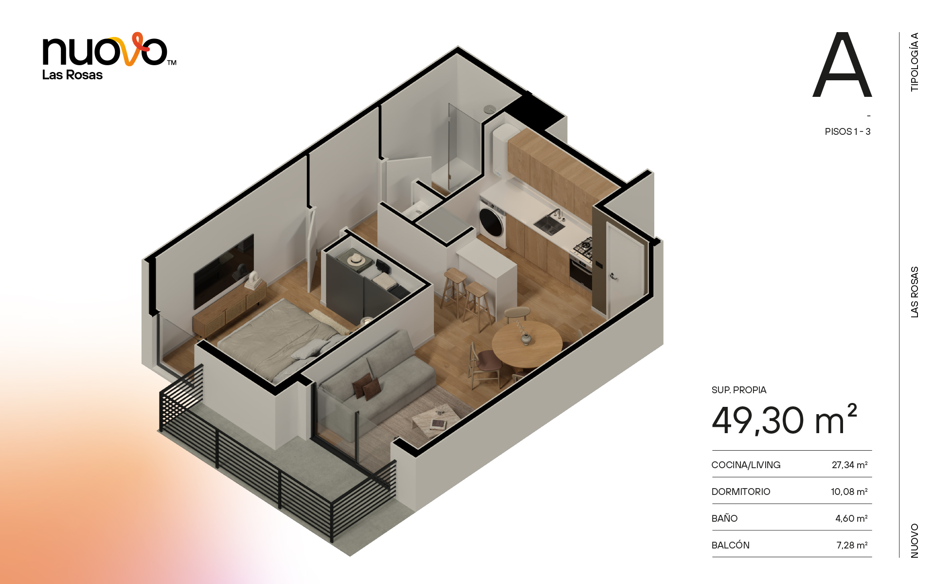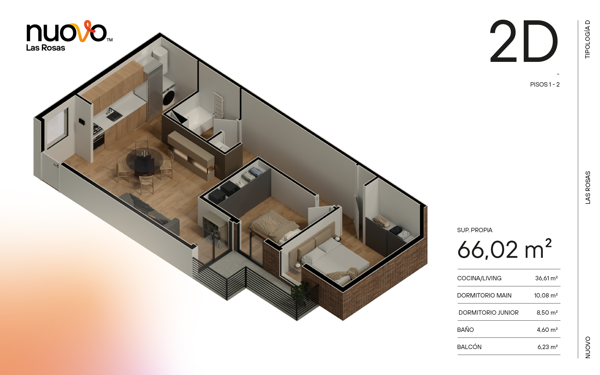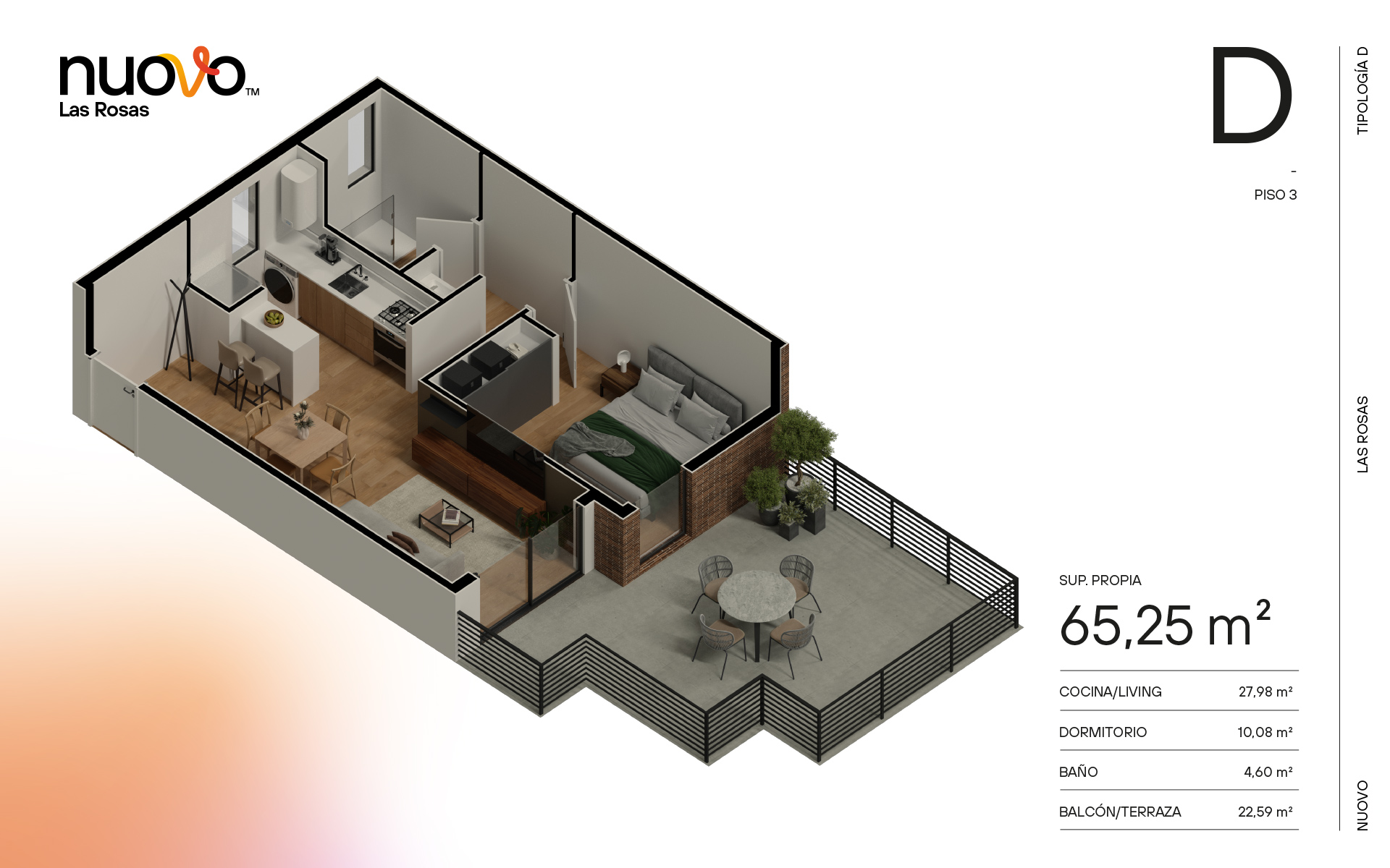 Nuovo® Las Rosas se compone de 14 departamentos de 1 dormitorio y 2 de dos dormitorios. Todos cuentan con las mejores terminaciones y tecnología.