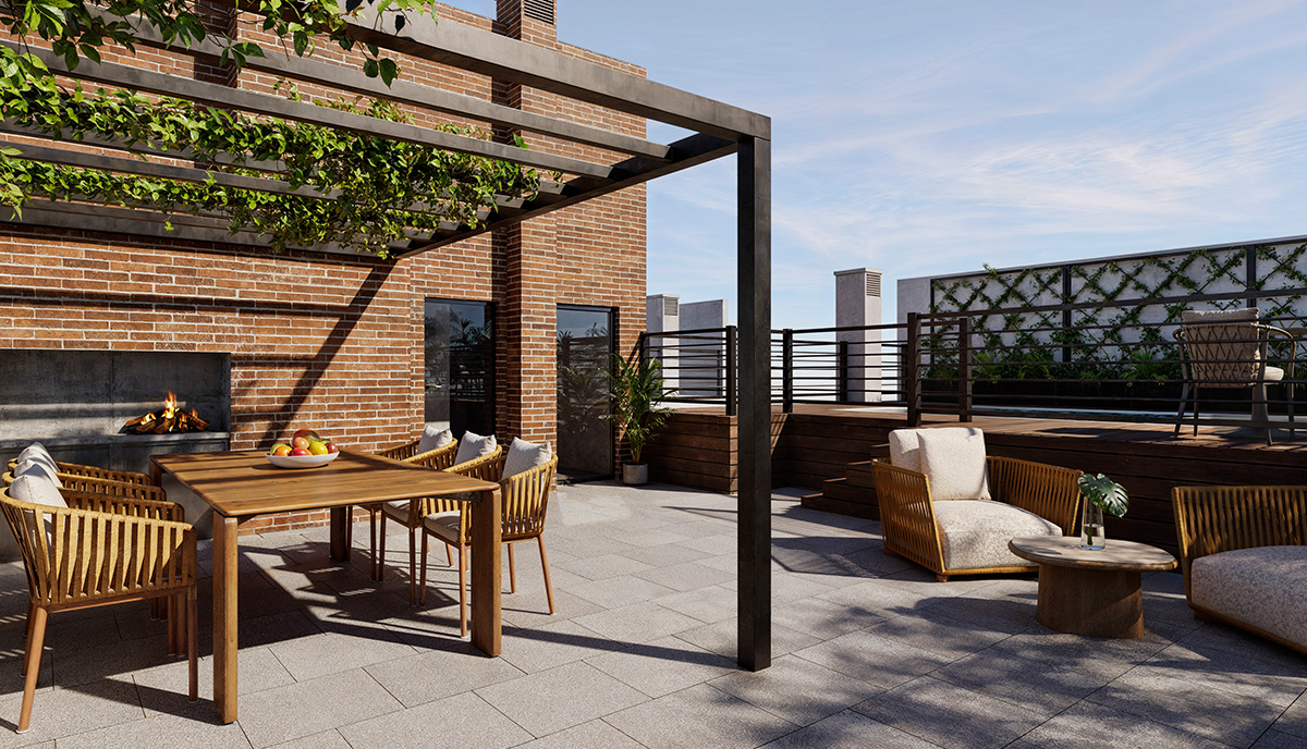 Nuovo LAS ROSAS también cuenta con una terraza de amenities exclusivos: piscina, solarium, lounge con asadores y vistas al río.
